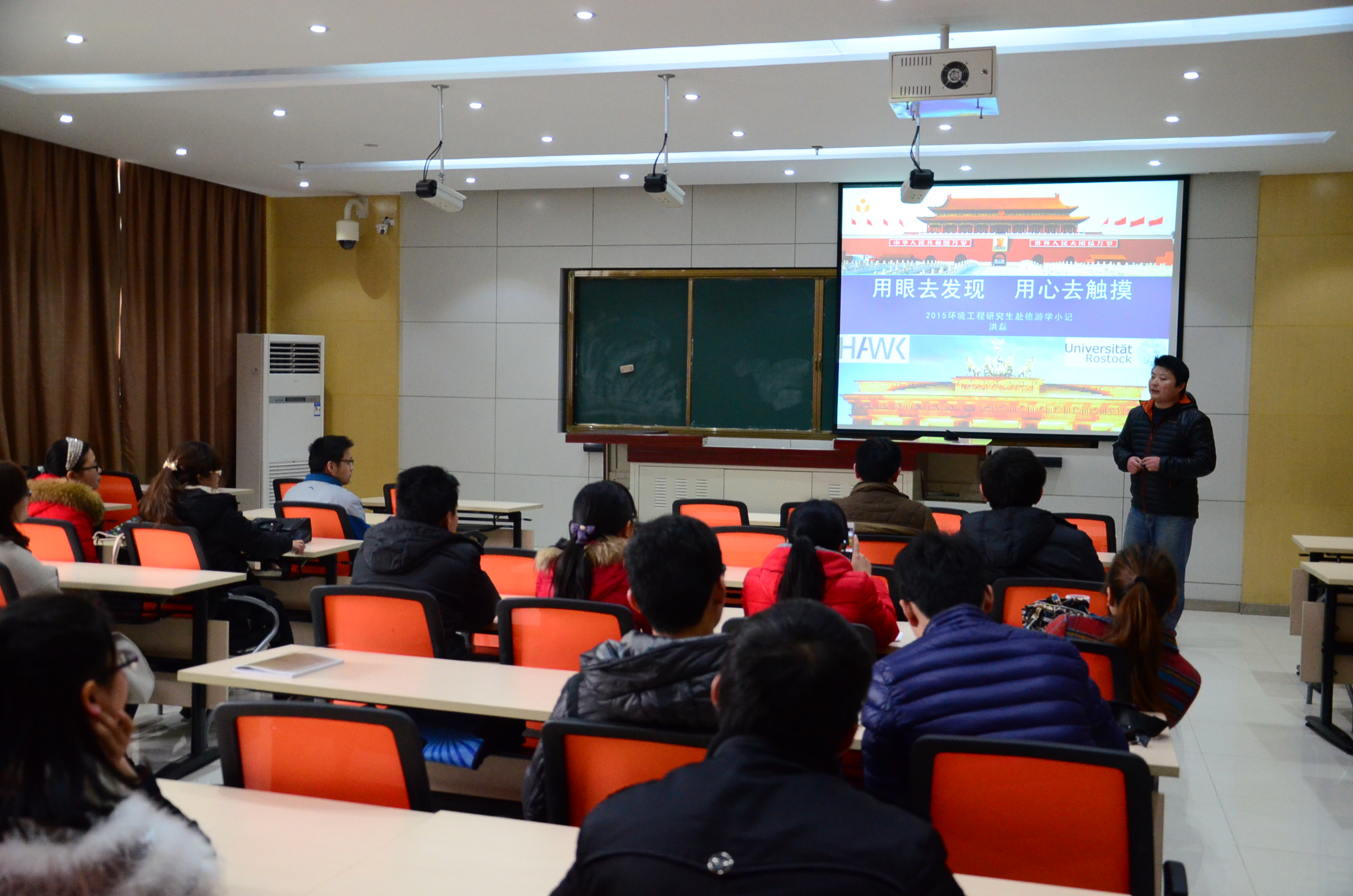 交流报告会上,游学指导教师王磊、洪磊、张金流分别介绍了带队赴韩国、德国以及在省内游学的情况。部分参加游学的学生也通过照片、视频等方式与大家分享了他们精彩纷呈的游学之旅,并讲述了他们参加此次游学的感悟和收获。据了解,2014年,我校共有8名研究生赴韩国湖西大学、天安市环境能源事务所、韩国电子产业环境协会、现代汽车公司(牙山工厂)污水处理厂参观游学。5名研究生赴德国哥廷根应用科学大学、罗斯托克大学、施特拉松德应用科学大学、云德生物能源村、弗劳恩霍夫研究院等游学。在省内游学的同学则赴青阳、滁州、蚌埠等地参观调研了相关的环保企业。