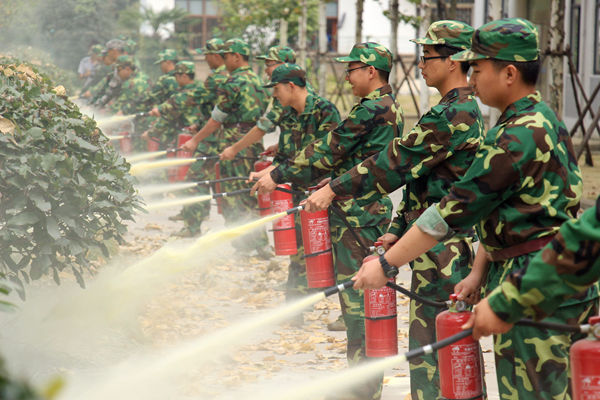 “今天,我们要进行一次灭火器演练活动,希望今天大家好好表现,尽量掌握灭火器的使用方法。这样,在以后遇到火警的时候,就不会乱了阵脚。”演练前,各方队集结,依次排列在演练场地前,教官们耐心地向所带领的方队讲述灭火器的种类与使用方法,并现场进行示范。演练开始,各方队逐列进行灭火器练习,每三人为一组,拿起指定场地摆放的灭火器,有序进入演练场地使用灭火器,然后再将灭火器放回指定地点。