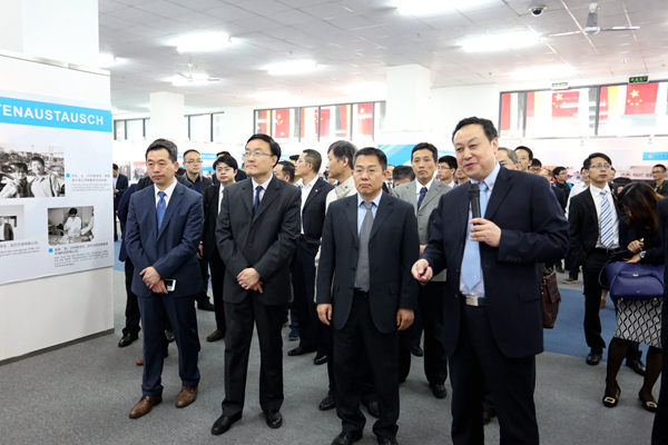 随后,双方共同参观了中德合作共建三十周年成果展,参展过程中,蔡敬民还就学院发展概况、办学定位等做出介绍。在两国总理的留言台处,翟谦为我校题字“不知不觉,先知先觉”。