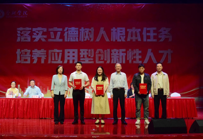 校领导为“合肥学院优秀毕业研究生代表”和“合肥学院优秀学生干部代表”颁发荣誉证书,表彰他们在学术研究、专业实践等方面的突出表现。