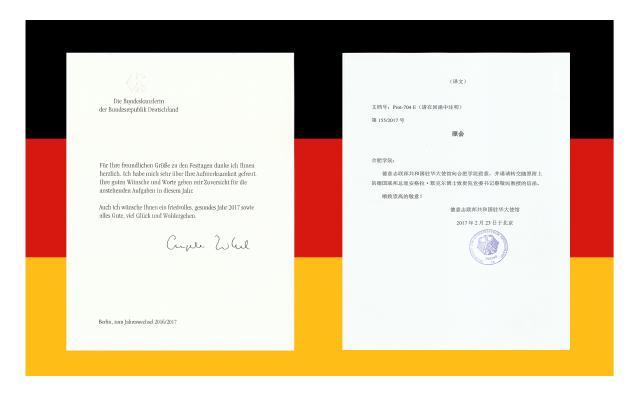 Der Senatspräsident der Universität Hefei, Prof. Dr. Cai Jingmin, empfing kürzlich ein von Bundeskanzlerin Angela Merkel eigenhändig verfasstes Schreiben, in dem sie ihre Neujahrswünsche an Herrn Senatspräsidenten Prof. Dr. Cai Jingmin sowie an die Universität Hefei äußerte. Damit ist es das dritte eigenhändig verfasste Schreiben, das die Universität Hefei bisher von Bundeskanzlerin erhielt.