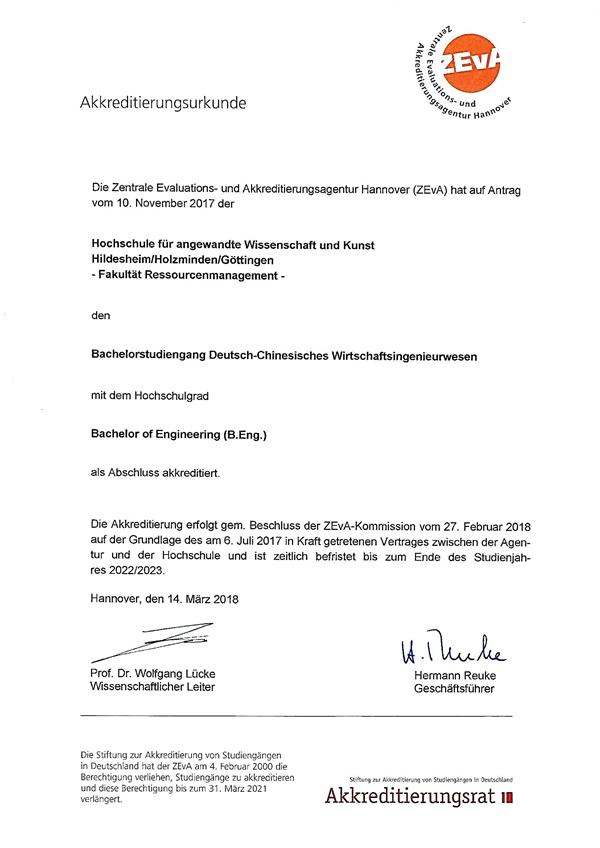 Im Juli 2017 wurde der Akkreditierungsantrag bei der zentralen evalsuierungs- und Akkreditierungsagentur gemeinsam von der Universität Hefei und der Hochschule für angewandte Wissenschaft und Kunst Hildesheim/Holzminden/Göttingen gestellt. Um die Akkreditierung zu vollenden, führte die evalsuations- und Akkreditierungsagentur Interviews und Lernmaterialkontrollen durch. Auch Videokonferenzen wurden geführt. Diese Erhebungen basierten auf vorherigen Kontrollen.
